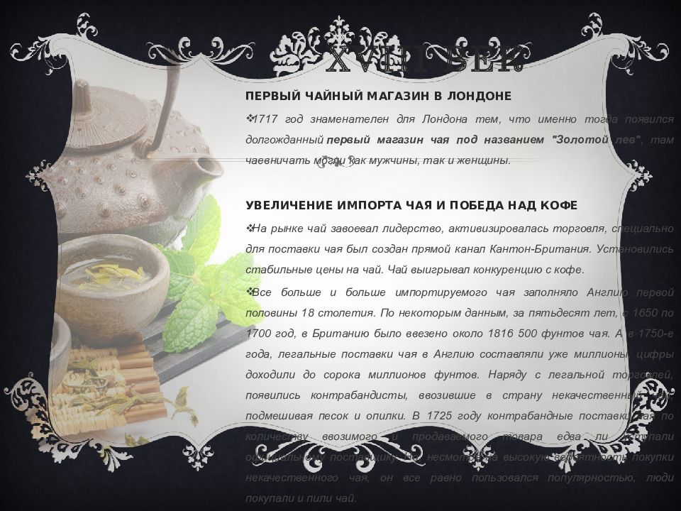 ПЕРВЫЙ ЧАЙНЫЙ МАГАЗИН В ЛОНДОНЕ 1717 год знаменателен для Лондона тем, что именно тогда появился долгожданный первый магазин чая под названием "Золотой лев", там чаевничать могли как мужчины, так и женщины. УВЕЛИЧЕНИЕ ИМПОРТА ЧАЯ И ПОБЕДА НАД КОФЕ На рынке чай завоевал лидерство, активизировалась торговля, специально для поставки чая был создан прямой канал Кантон-Британия. Установились стабильные цены на чай. Чай выигрывал конкуренцию с кофе. Все больше и больше импортируемого чая заполняло Англию первой половины 18 столетия. По некоторым данным, за пятьдесят лет, с 1650 по 1700 год, в Британию было ввезено около 1816 500 фунтов чая. А в 1750-е года, легальные поставки чая в Англию составляли уже миллионы, цифры доходили до сорока миллионов фунтов. Наряду с легальной торговлей, появились контрабандисты, ввозившие в страну некачественный чай, подмешивая песок и опилки. В 1725 году контрабандные поставки чая по количеству ввозимого и продаваемого товара едва ли уступали официальному поставщику. Но, несмотря на высокую вероятность покупки некачественного чая, он все равно пользовался популярностью, люди покупали и пили чай.