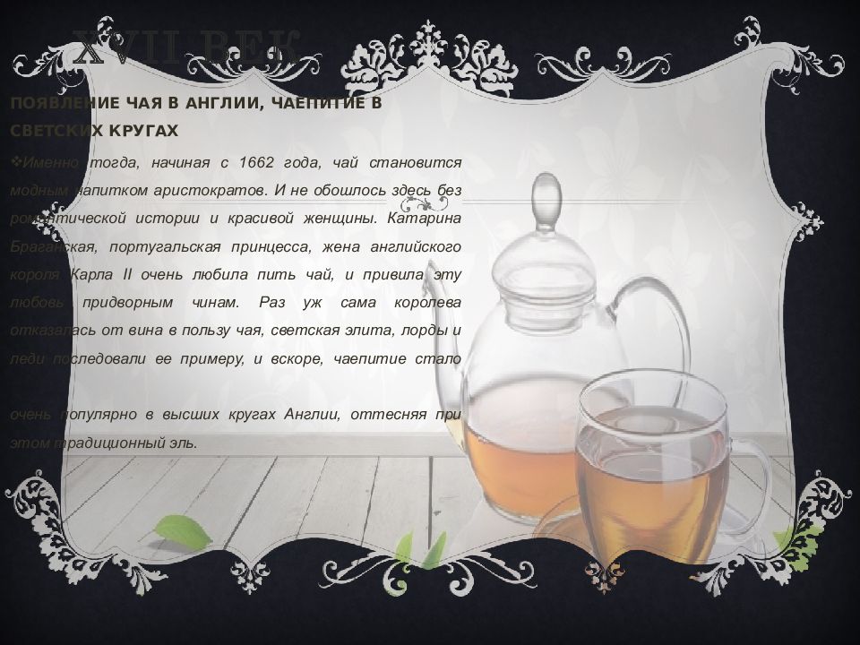 ПОЯВЛЕНИЕ ЧАЯ В АНГЛИИ, ЧАЕПИТИЕ В СВЕТСКИХ КРУГАХ Именно тогда, начиная с 1662 года, чай становится модным напитком аристократов. И не обошлось здесь без романтической истории и красивой женщины. Катарина Браганская, португальская принцесса, жена английского короля Карла II очень любила пить чай, и привила эту любовь придворным чинам. Раз уж сама королева отказалась от вина в пользу чая, светская элита, лорды и леди последовали ее примеру, и вскоре, чаепитие стало очень популярно в высших кругах Англии, оттесняя при этом традиционный эль.