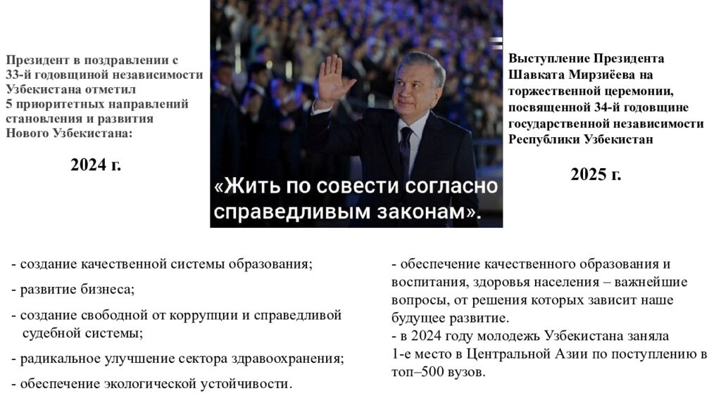 - создание качественной системы образования; - развитие бизнеса; - создание свободной от коррупции и справедливой судебной системы; - радикальное улучшение сектора здравоохранения; - обеспечение экологической устойчивости. - обеспечение качественного образования и воспитания, здоровья населения – важнейшие вопросы, от решения которых зависит наше будущее развитие. - в 2024 году молодежь Узбекистана заняла 1-е место в Центральной Азии по поступлению в топ–500 вузов. Выступление Президента Шавката Мирзиёева на торжественной церемонии, посвященной 34-й годовщине государственной независимости Республики Узбекистан 2025 г. 2024 г.
