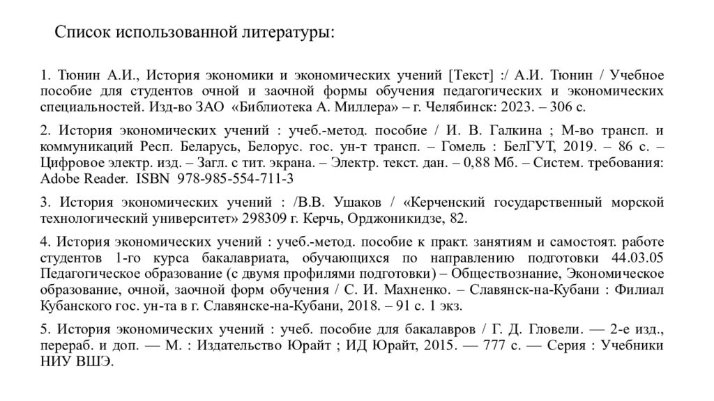 1. Тюнин А.И., История экономики и экономических учений [ Текст] :/ А.И. Тюнин / Учебное пособие для студентов очной и заочной формы обучения педагогических и экономических специальностей. Изд-во ЗАО « Библиотека А. Миллера» – г. Челябинск: 2023. – 306 с. 2. История экономических учений : учеб.-метод. пособие / И. В. Галкина ; М-во трансп. и коммуникаций Респ. Беларусь, Белорус. гос. ун-т трансп. – Гомель : БелГУТ, 2019. – 86 с. – Цифровое электр. изд. – Загл. с тит. экрана. – Электр. текст. дан. – 0,88 Мб. – Систем. требования: Adobe Reader. ISBN 978-985-554-711-3 3. История экономических учений : /В.В. Ушаков / «Керченский государственный морской технологический университет» 298309 г. Керчь, Орджоникидзе, 82. 4. История экономических учений : учеб.-метод. пособие к практ. занятиям и самостоят. работе студентов 1-го курса бакалавриата, обучающихся по направлению подготовки 44.03.05 Педагогическое образование (с двумя профилями подготовки) – Обществознание, Экономическое образование, очной, заочной форм обучения / С. И. Махненко. – Славянск-на-Кубани : Филиал Кубанского гос. ун-та в г. Славянске-на-Кубани, 2018. – 91 с. 1 экз. 5. История экономических учений : учеб. пособие для бакалавров / Г. Д. Гловели. — 2-е изд., перераб. и доп. — М. : Издательство Юрайт ; ИД Юрайт, 2015. — 777 с. — Серия : Учебники НИУ ВШЭ.