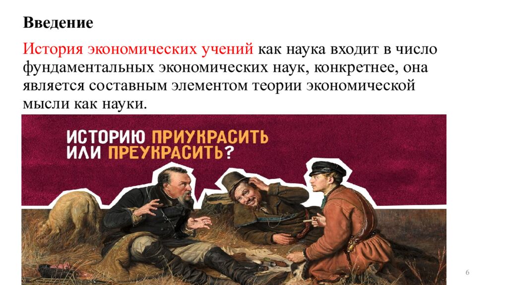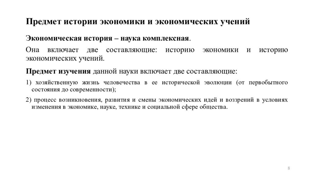 Экономическая история – наука комплексная. Она включает две составляющие: историю экономики и историю экономических учений. Предмет изучения данной науки включает две составляющие: 1) хозяйственную жизнь человечества в ее исторической эволюции (от первобытного состояния до современности); 2) процесс возникновения, развития и смены экономических идей и воззрений в условиях изменения в экономике, науке, технике и социальной сфере общества. 8