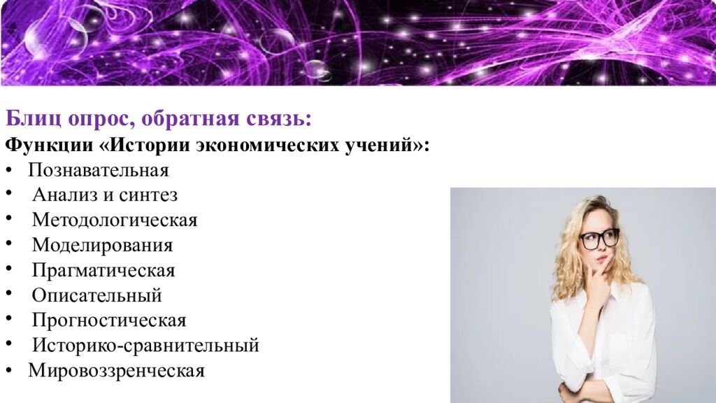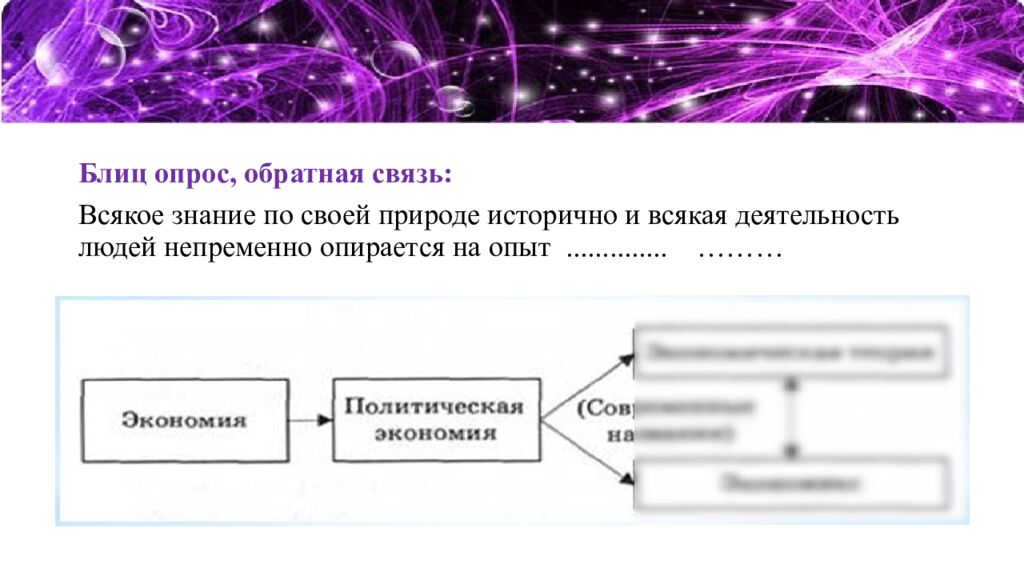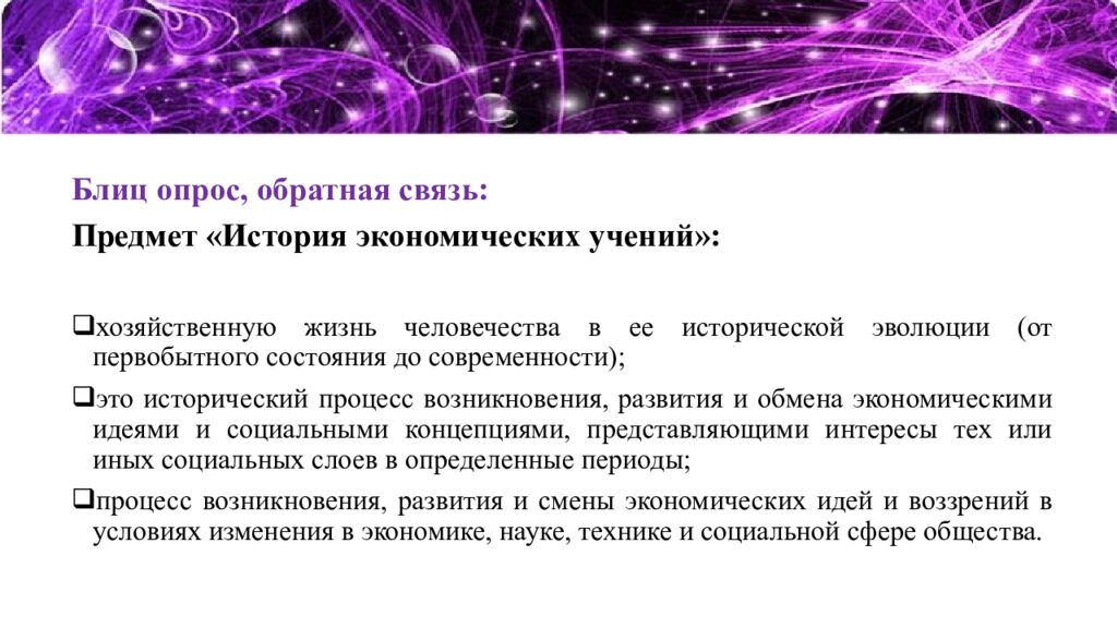 Блиц опрос, обратная связь: Предмет «История экономических учений »: хозяйственную жизнь человечества в ее исторической эволюции (от первобытного состояния до современности ); это исторический процесс возникновения, развития и обмена экономическими идеями и социальными концепциями, представляющими интересы тех или иных социальных слоев в определенные периоды; процесс возникновения, развития и смены экономических идей и воззрений в условиях изменения в экономике, науке, технике и социальной сфере общества.
