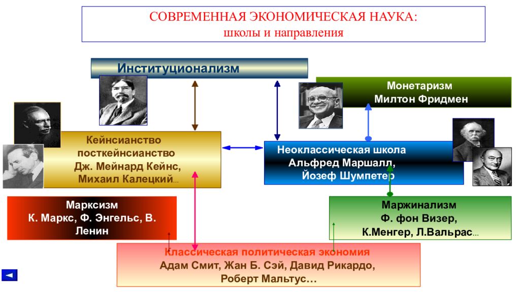 Классическая политическая экономия Адам Смит, Жан Б. Сэй, Давид Рикардо, Роберт Мальтус… Марксизм К. Маркс, Ф. Энгельс, В. Ленин Маржинализм Ф. фон Визер, К. Менгер, Л.Вальрас … Неоклассическая школа Альфред Маршалл, Йозеф Шумпетер Монетаризм Милтон Фридмен Кейнсианство посткейнсианство Дж. Мейнард Кейнс, Михаил Калецкий … Институционализм