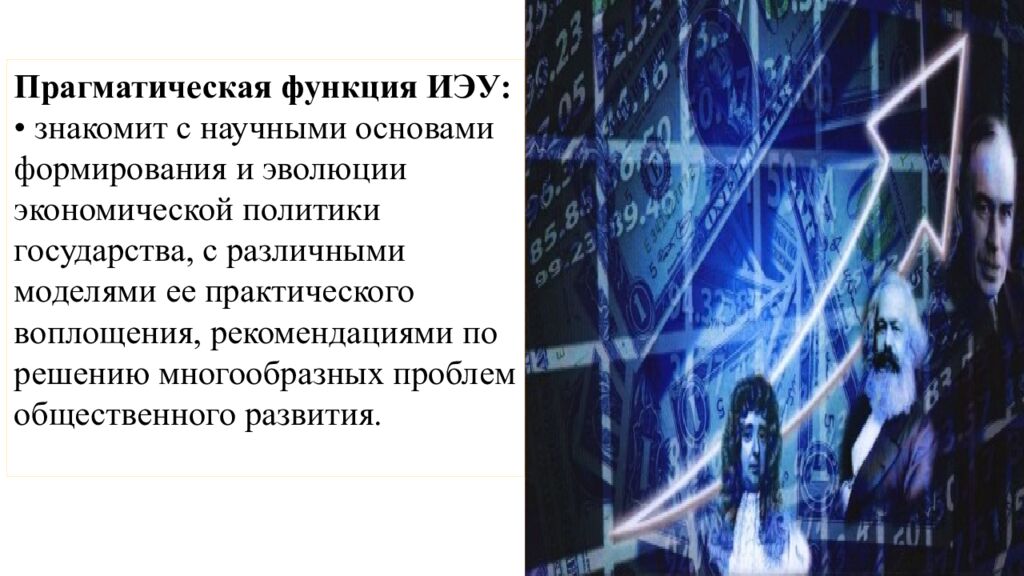 Прагматическая функция ИЭУ: • знакомит с научными основами формирования и эволюции экономической политики государства, с различными моделями ее практического воплощения, рекомендациями по решению многообразных проблем общественного развития.