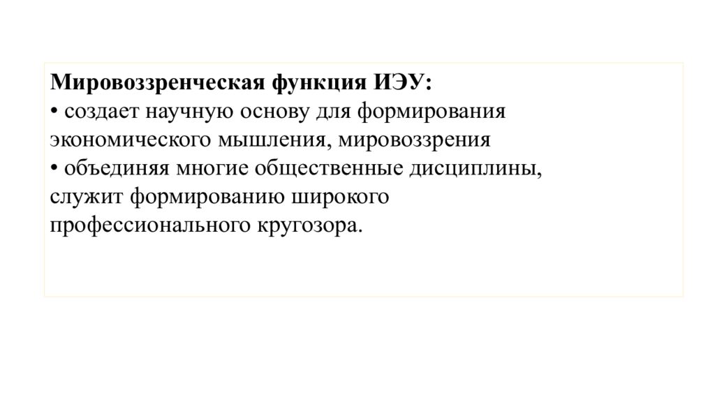 Мировоззренческая функция ИЭУ: • создает научную основу для формирования экономического мышления, мировоззрения • объединяя многие общественные дисциплины, служит формированию широкого профессионального кругозора.