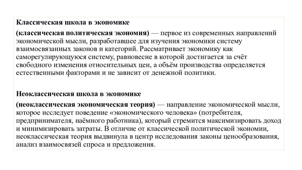Классическая школа в экономике (классическая политическая экономия) — первое из современных направлений экономической мысли, разработавшее для изучения экономики систему взаимосвязанных законов и категорий. Рассматривает экономику как саморегулирующуюся систему, равновесие в которой достигается за счёт свободного изменения относительных цен, а объём производства определяется естественными факторами и не зависит от денежной политики. Неоклассическая школа в экономике ( неоклассическая экономическая теория) — направление экономической мысли, которое исследует поведение «экономического человека» (потребителя, предпринимателя, наёмного работника), который стремится максимизировать доход и минимизировать затраты. В отличие от классической политической экономии, неоклассическая теория выдвинула в центр исследования законы ценообразования, анализ взаимосвязей спроса и предложения.