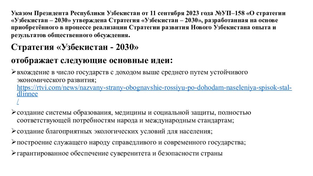 Указом Президента Республики Узбекистан от 11 сентября 2023 года №УП–158 «О стратегии «Узбекистан – 2030» утверждена Стратегия «Узбекистан – 2030», разработанная на основе приобретённого в процессе реализации Стратегии развития Нового Узбекистана опыта и результатов общественного обсуждения. Стратегия «Узбекистан - 2030» отображает следующие основные идеи: вхождение в число государств с доходом выше среднего путем устойчивого экономического развития ; https://rtvi.com/news/nazvany-strany-obognavshie-rossiyu-po-dohodam-naseleniya-spisok-stal-dlinnee / создание системы образования, медицины и социальной защиты, полностью соответствующей потребностям народа и международным стандартам; создание благоприятных экологических условий для населения; построение служащего народу справедливого и современного государства; гарантированное обеспечение суверенитета и безопасности страны