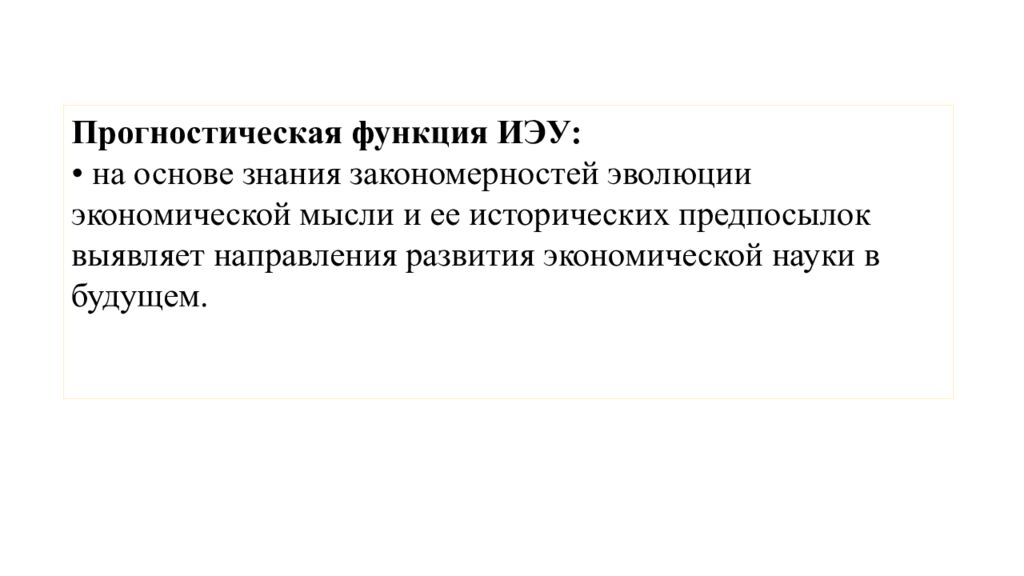Прогностическая функция ИЭУ: • на основе знания закономерностей эволюции экономической мысли и ее исторических предпосылок выявляет направления развития экономической науки в будущем.