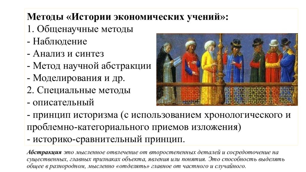 Методы «Истории экономических учений »: 1. Общенаучные методы - Наблюдение - Анализ и синтез - Метод научной абстракции - Моделирования и др. 2. Специальные методы - описательный - принцип историзма (с использованием хронологического и проблемно-категориального приемов изложения) - историко-сравнительный принцип. Абстракция это мысленное отвлечение от второстепенных деталей и сосредоточение на существенных, главных признаках объекта, явления или понятия. Это способность выделять общее в разнородном, мысленно «отделять» главное от частного и случайного.
