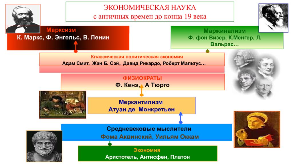 Экономия Аристотель, Антисфен, Платон ФИЗИОКРАТЫ Ф. Кенэ, А Тюрго Меркантилизм Атуан де Монкретьен Классическая политическая экономия Адам Смит, Жан Б. Сэй, Давид Рикардо, Роберт Мальтус … Средневековые мыслители Фома Аквинский, Уильям Оккам Марксизм К. Маркс, Ф. Энгельс, В. Ленин Маржинализм Ф. фон Визер, К.Менгер, Л. Вальрас…