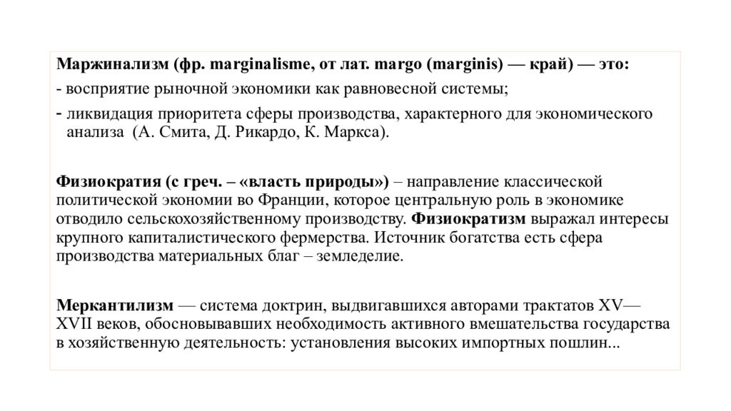 Маржинализм (фр. marginalisme, от лат. margo ( marginis ) — край) — это: - восприятие рыночной экономики как равновесной системы ; ликвидация приоритета сферы производства, характерного для экономического анализа (А. Смита, Д. Рикардо, К. Маркса ). Физиократия (с греч. – «власть природы») – направление классической политической экономии во Франции, которое центральную роль в экономике отводило сельскохозяйственному производству. Физиократизм выражал интересы крупного капиталистического фермерства. Источник богатства есть сфера производства материальных благ – земледелие. Меркантилизм — система доктрин, выдвигавшихся авторами трактатов XV—XVII веков, обосновывавших необходимость активного вмешательства государства в хозяйственную деятельность: установления высоких импортных пошлин...