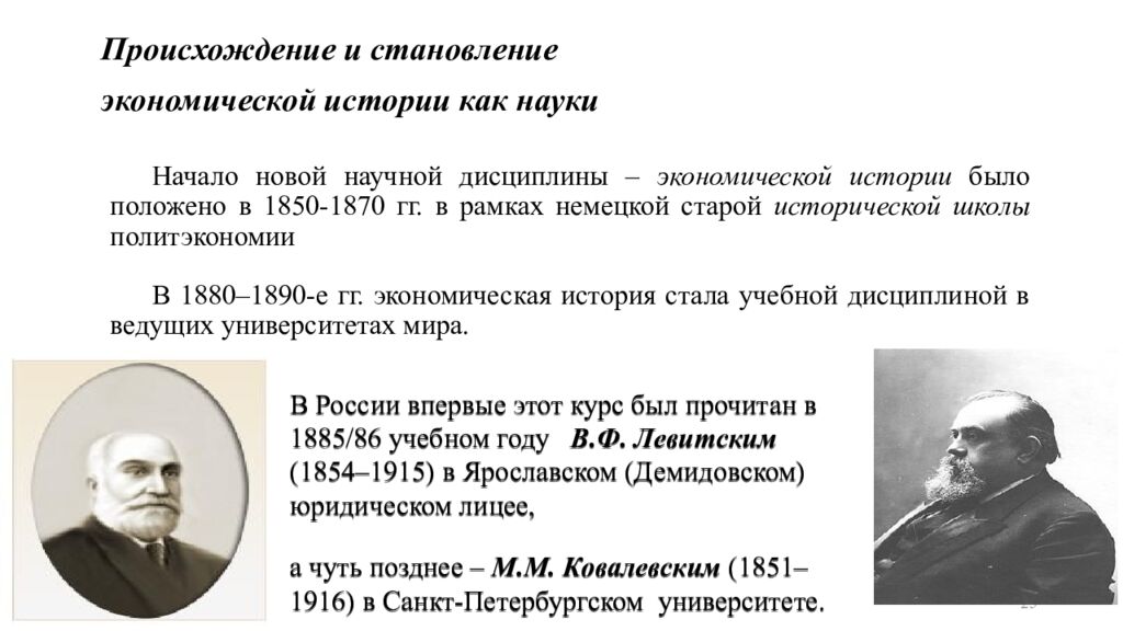 Начало новой научной дисциплины – экономической истории было положено в 1850-1870 гг. в рамках немецкой старой исторической школы политэкономии В 1880–1890-е гг. экономическая история стала учебной дисциплиной в ведущих университетах мира. 25 В России впервые этот курс был прочитан в 1885/86 учебном году В.Ф. Левитским ( 1854–1915) в Ярославском (Демидовском) юридическом лицее, а чуть позднее – М.М. Ковалевским (1851–1916) в Санкт-Петербургском университете.