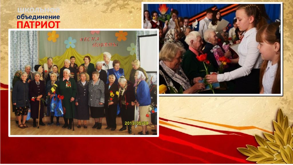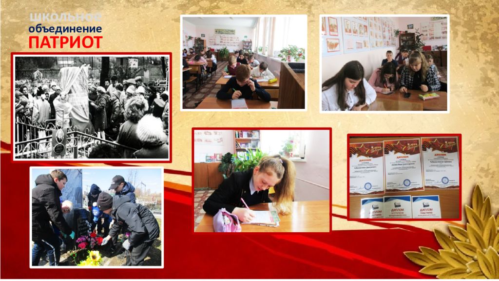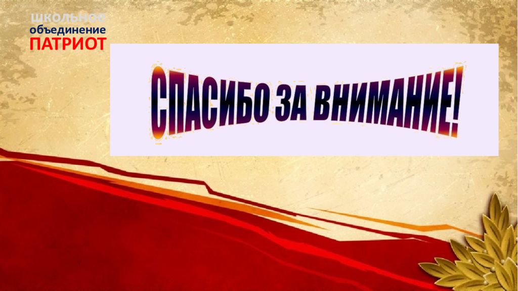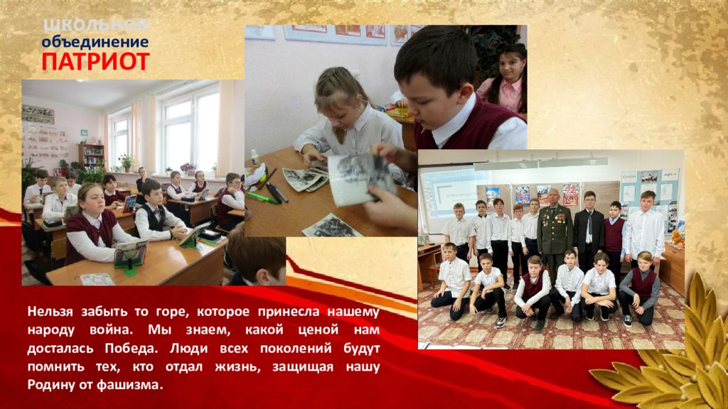 ПАТРИОТ объединение школьное Нельзя забыть то горе, которое принесла нашему народу война. Мы знаем, какой ценой нам досталась Победа. Люди всех поколений будут помнить тех, кто отдал жизнь, защищая нашу Родину от фашизма.