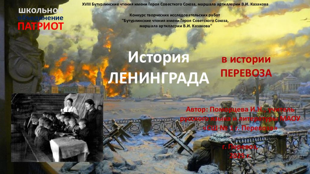 История ЛЕНИНГРАДА Автор: Поморцева И.Н., учитель русского языка и литературы МАОУ «СШ № 1 г. Перевоза» г. Перевоз, 2025 г. ПАТРИОТ объединение школьное в истории ПЕРЕВОЗА XVIII Бутурлинские чтения имени Героя Совесткого Союза, маршала артиллерии В.И. Казакова Конкурс творческих исследовательских работ " Бутурлинские чтения имени Героя Советского Союза, маршала артиллерии В.И. Казакова"