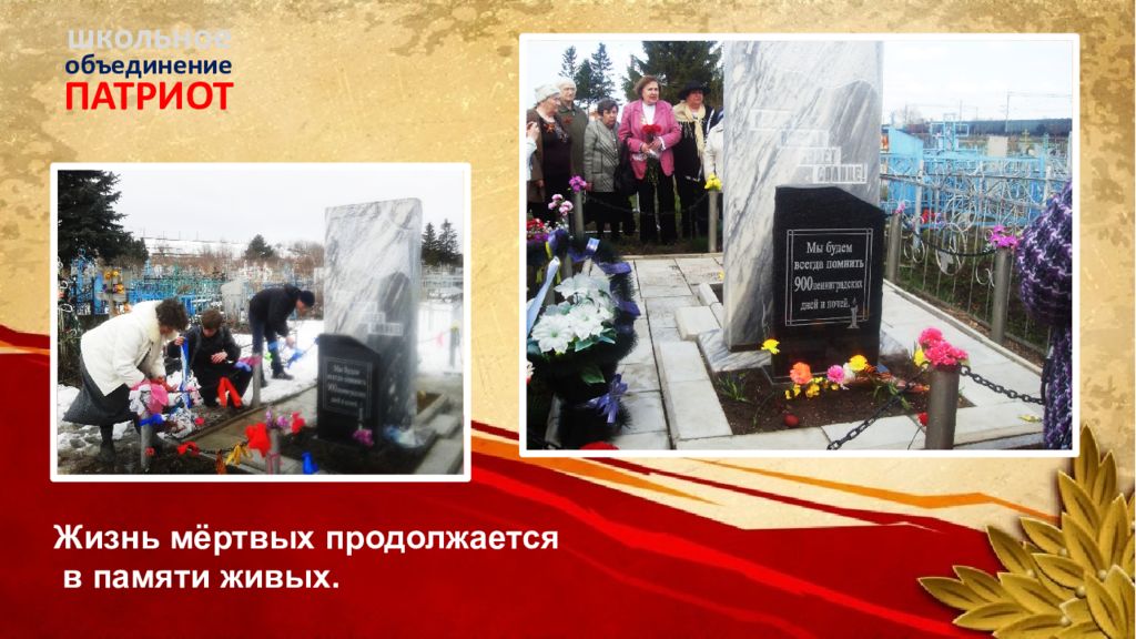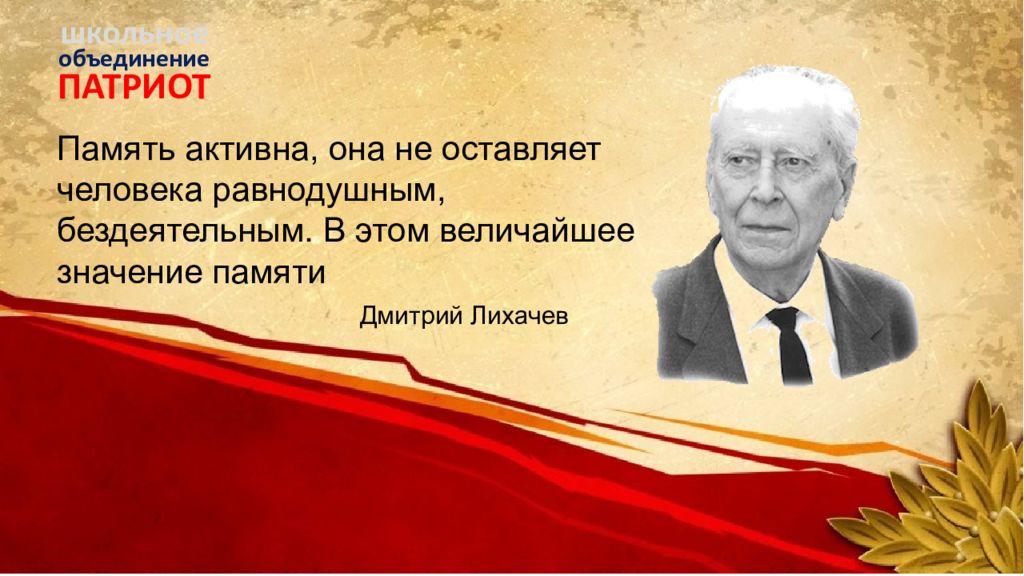 ПАТРИОТ объединение школьное Память активна, она не оставляет человека равнодушным, бездеятельным. В этом величайшее значение памяти Дмитрий Лихачев