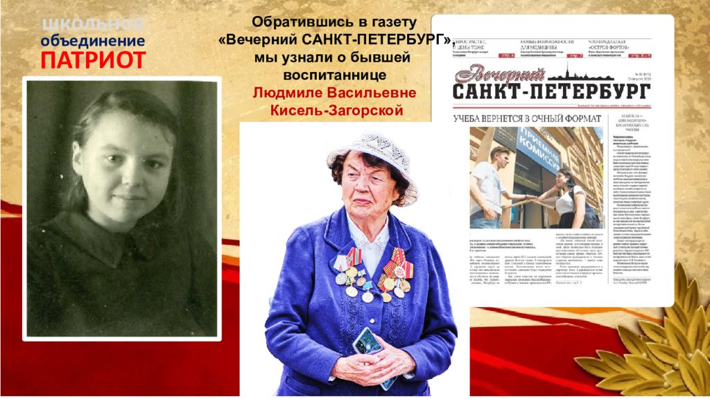 ПАТРИОТ объединение школьное Обратившись в газету «Вечерний САНКТ-ПЕТЕРБУРГ», мы узнали о бывшей воспитаннице Людмиле Васильевне Кисель- Загорской