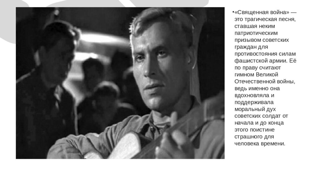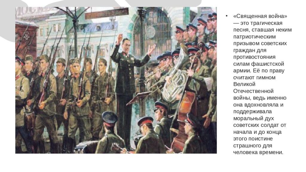 « Священная война» — это трагическая песня, ставшая неким патриотическим призывом советских граждан для противостояния силам фашистской армии. Её по праву считают гимном Великой Отечественной войны, ведь именно она вдохновляла и поддерживала моральный дух советских солдат от начала и до конца этого поистине страшного для человека времени.