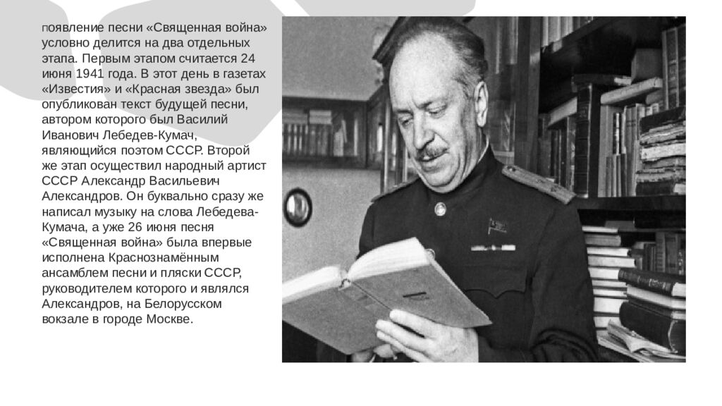 П оявление песни «Священная война» условно делится на два отдельных этапа. Первым этапом считается 24 июня 1941 года. В этот день в газетах «Известия» и «Красная звезда» был опубликован текст будущей песни, автором которого был Василий Иванович Лебедев-Кумач, являющийся поэтом СССР. Второй же этап осуществил народный артист СССР Александр Васильевич Александров. Он буквально сразу же написал музыку на слова Лебедева-Кумача, а уже 26 июня песня «Священная война» была впервые исполнена Краснознамённым ансамблем песни и пляски СССР, руководителем которого и являлся Александров, на Белорусском вокзале в городе Москве.