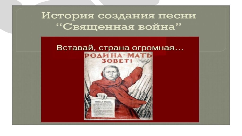 Первый слайд презентации: ИСТОРИЯ СОЗДАНИЯ ПЕСНИ О ВОВ
