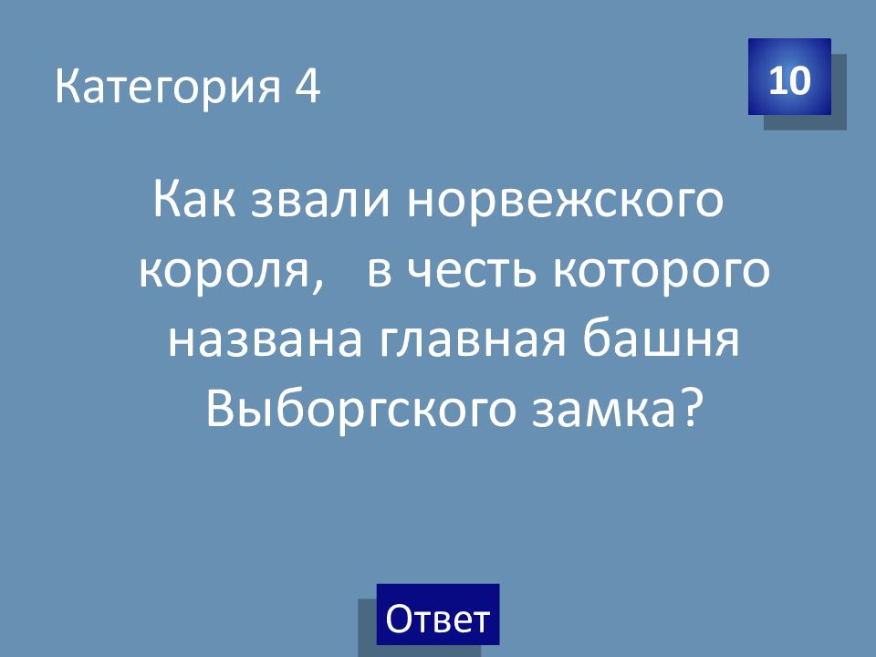Как звали норвежского короля, в честь которого названа главная башня Выборгского замка? 10