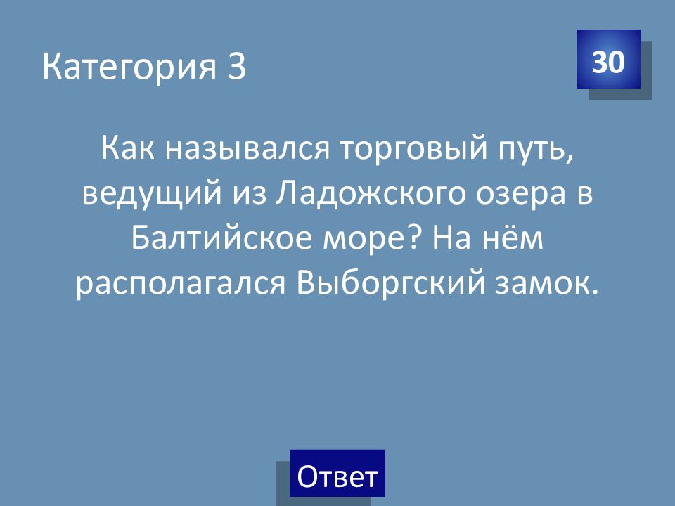 Как назывался торговый путь, ведущий из Ладожского озера в Балтийское море? На нём располагался Выборгский замок. 3 0