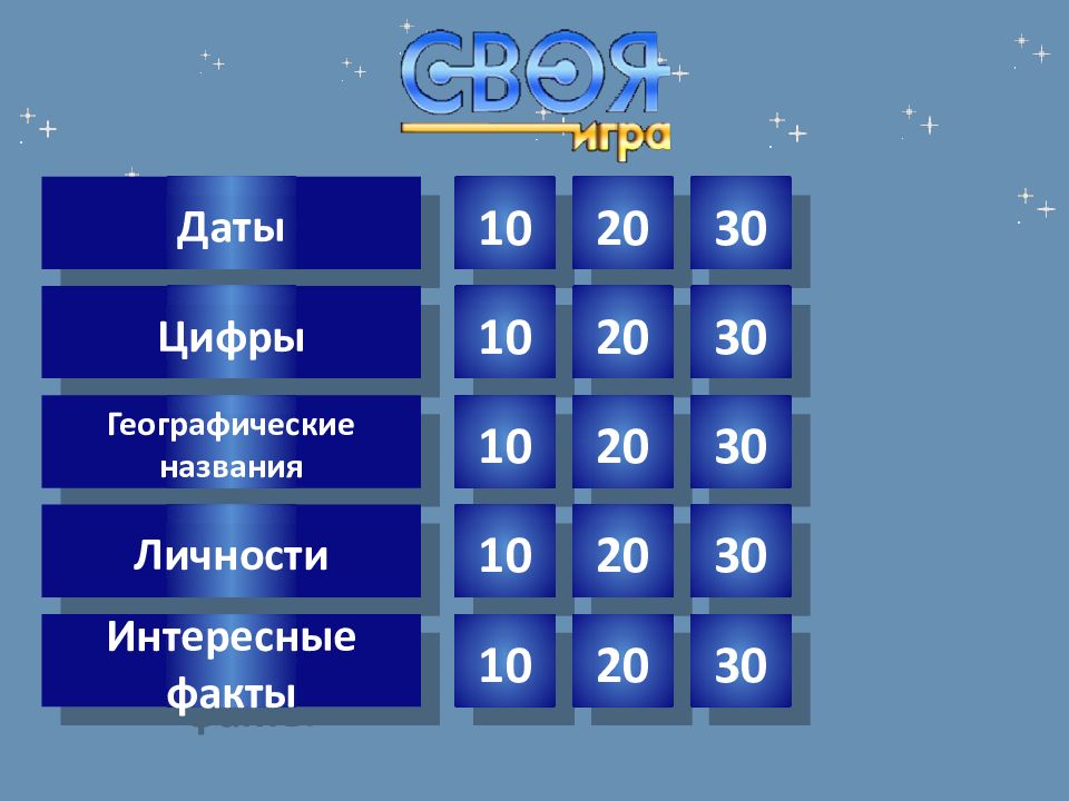 10 20 30 10 20 30 10 20 30 10 20 30 10 20 30 Даты Цифры Географические названия Личности Интересные факты
