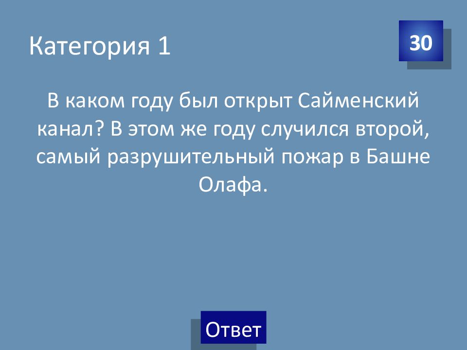В каком году был открыт Сайменский канал? В этом же году случился второй, самый разрушительный пожар в Башне Олафа. 3 0