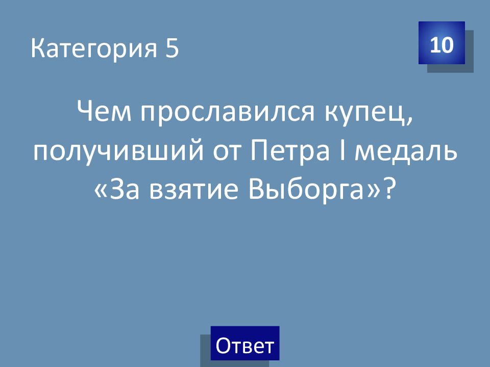 Чем прославился купец, получивший от Петра I медаль «За взятие Выборга»? 10