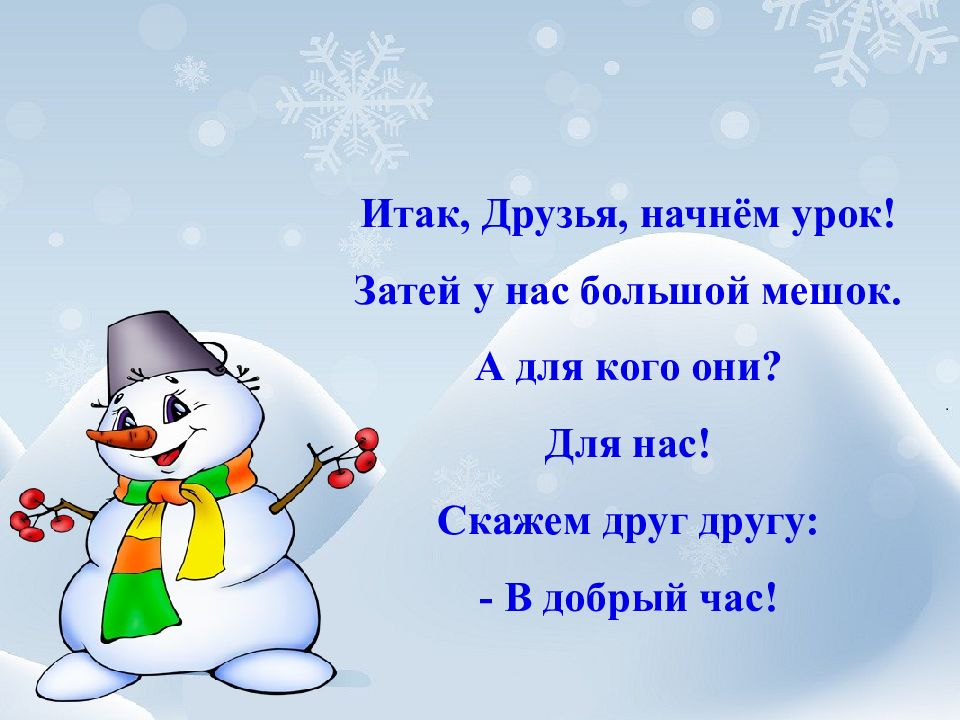 Итак, Друзья, начнём урок! Затей у нас большой мешок. А для кого они? Для нас! Скажем друг другу: - В добрый час!