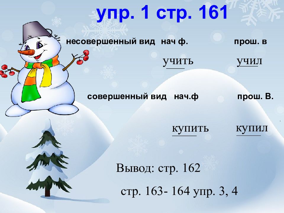 несовершенный вид нач ф. прош. в учить учил совершенный вид нач.ф прош. В. купить купил Вывод: стр. 162 стр. 163- 164 упр. 3, 4