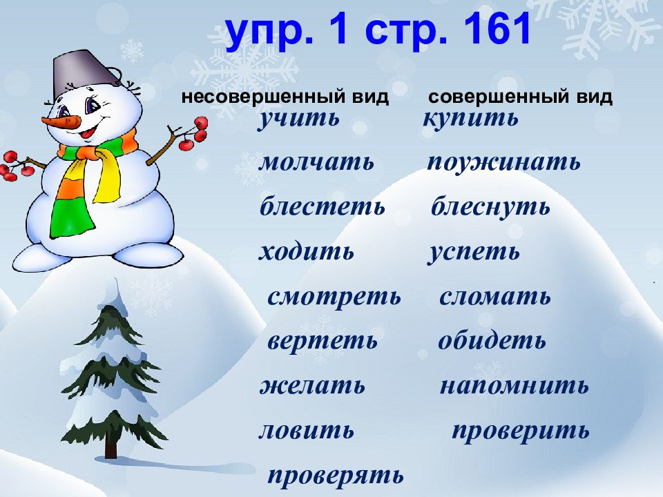 несовершенный вид совершенный вид учить купить молчать поужинать блестеть блеснуть ходить успеть смотреть сломать вертеть обидеть желать напомнить ловить проверить проверять
