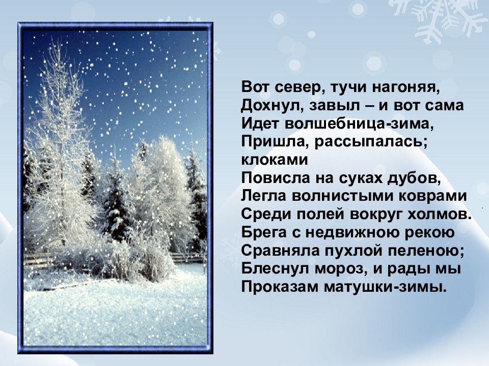 Вот север, тучи нагоняя, Дохнул, завыл – и вот сама Идет волшебница-зима, Пришла, рассыпалась; клоками Повисла на суках дубов, Легла волнистыми коврами Среди полей вокруг холмов. Брега с недвижною рекою Сравняла пухлой пеленою; Блеснул мороз, и рады мы Проказам матушки-зимы.