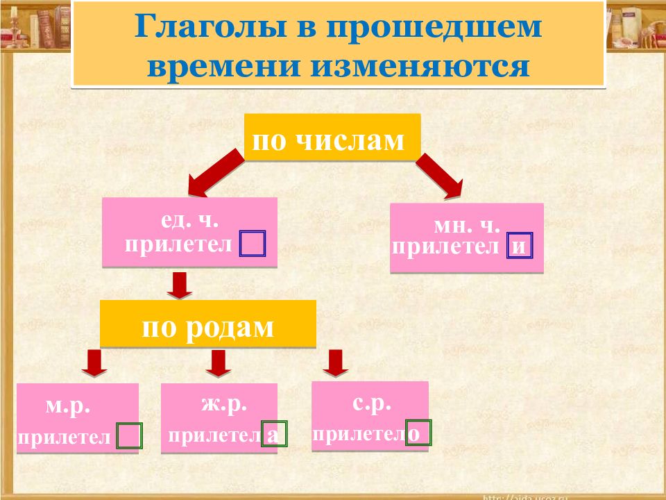по числам ед. ч. мн. ч. прилетел прилетел по родам и Глаголы в прошедшем времени изменяются с.р. прилетел ж.р. прилетел м.р. прилетел а о