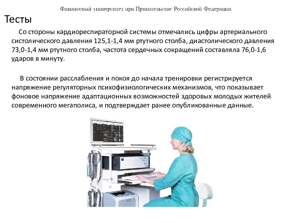 Со стороны кардиореспираторной системы отмечались цифры артериального систолического давления 125,1-1,4 мм ртутного столба, диастолического давления 73,0-1,4 мм ртутного столба, частота сердечных сокращений составляла 76,0-1,6 ударов в минуту. В состоянии расслабления и покоя до начала тренировки регистрируется напряжение регуляторных психофизиологических механизмов, что показывает фоновое напряжение адаптационных возможностей здоровых молодых жителей современного мегаполиса, и подтверждает ранее опубликованные данные. Тесты