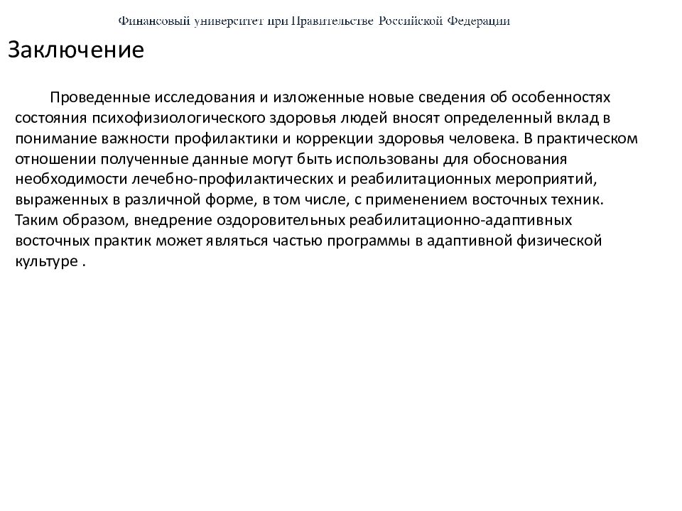 Проведенные исследования и изложенные новые сведения об особенностях состояния психофизиологического здоровья людей вносят определенный вклад в понимание важности профилактики и коррекции здоровья человека. В практическом отношении полученные данные могут быть использованы для обоснования необходимости лечебно-профилактических и реабилитационных мероприятий, выраженных в различной форме, в том числе, с применением восточных техник. Таким образом, внедрение оздоровительных реабилитационно-адаптивных восточных практик может являться частью программы в адаптивной физической культуре. Заключение