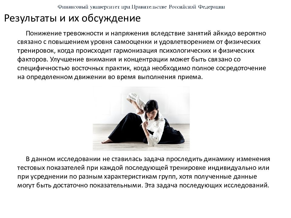 Понижение тревожности и напряжения вследствие занятий айкидо вероятно связано с повышением уровня самооценки и удовлетворением от физических тренировок, когда происходит гармонизация психологических и физических факторов. Улучшение внимания и концентрации может быть связано со специфичностью восточных практик, когда необходимо полное сосредоточение на определенном движении во время выполнения приема. В данном исследовании не ставилась задача проследить динамику изменения тестовых показателей при каждой последующей тренировке индивидуально или при усреднении по разным характеристикам групп, хотя полученные данные могут быть достаточно показательными. Эта задача последующих исследований.