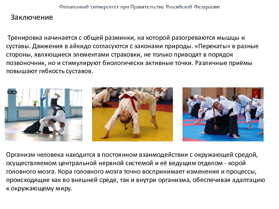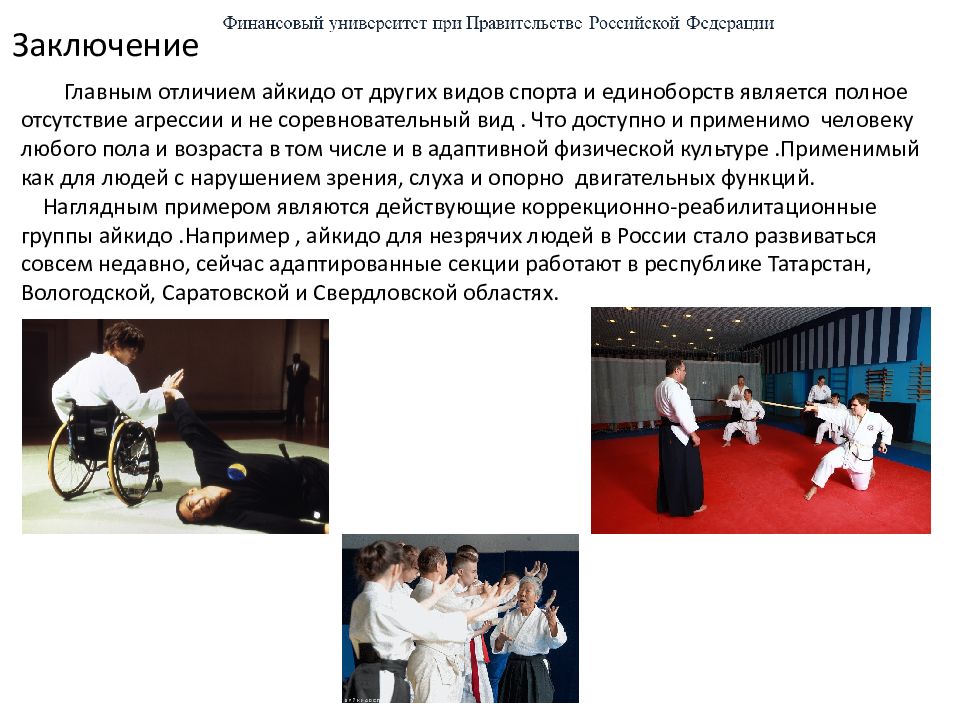Главным отличием айкидо является полное отсутствие агрессии. Тренировка начинается с общей разминки, на которой разогреваются мышцы и суставы. Движения в айкидо согласуются с законами природы. «Перекаты» в разные стороны, являющиеся элементами страховки, не только приводят в порядок позвоночник, но и стимулируют биологически активные точки. Различные приёмы повышают гибкость суставов. Организм человека находится в постоянном взаимодействии с окружающей средой, осуществляемом центральной нервной системой и е ведущим отделом - корой головного мозга. Кора головного мозга точно воспринимает изменения и процессы, происходящие как во внешней среде, так и внутри организма, обеспечивая адаптацию к окружающему миру. . Главным отличием айкидо от других видов спорта и единоборств является полное отсутствие агрессии и не соревновательный вид. Что доступно и применимо человеку любого пола и возраста в том числе и в адаптивной физической культуре.Применимый как для людей с нарушением зрения, слуха и опорно двигательных функций. Наглядным примером являются действующие коррекционно-реабилитационные группы айкидо.Например, айкидо для незрячих людей в России стало развиваться совсем недавно, сейчас адаптированные секции работают в республике Татарстан, Вологодской, Саратовской и Свердловской областях. Заключение