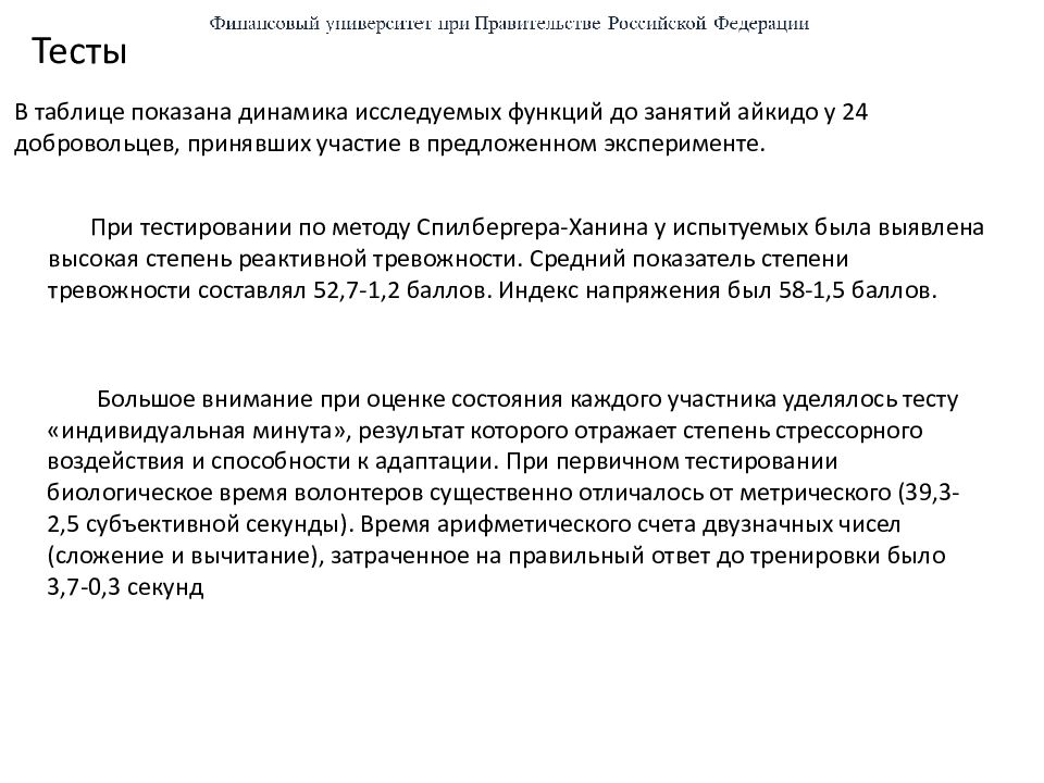 В таблице показана динамика исследуемых функций до занятий айкидо у 24 добровольцев, принявших участие в предложенном эксперименте. При тестировании по методу Спилбергера -Ханина у испытуемых была выявлена высокая степень реактивной тревожности. Средний показатель степени тревожности составлял 52,7-1,2 баллов. Индекс напряжения был 58-1,5 баллов. Большое внимание при оценке состояния каждого участника уделялось тесту «индивидуальная минута», результат которого отражает степень стрессорного воздействия и способности к адаптации. При первичном тестировании биологическое время волонтеров существенно отличалось от метрического (39,3-2,5 субъективной секунды). Время арифметического счета двузначных чисел (сложение и вычитание), затраченное на правильный ответ до тренировки было 3,7-0,3 секунд Тесты