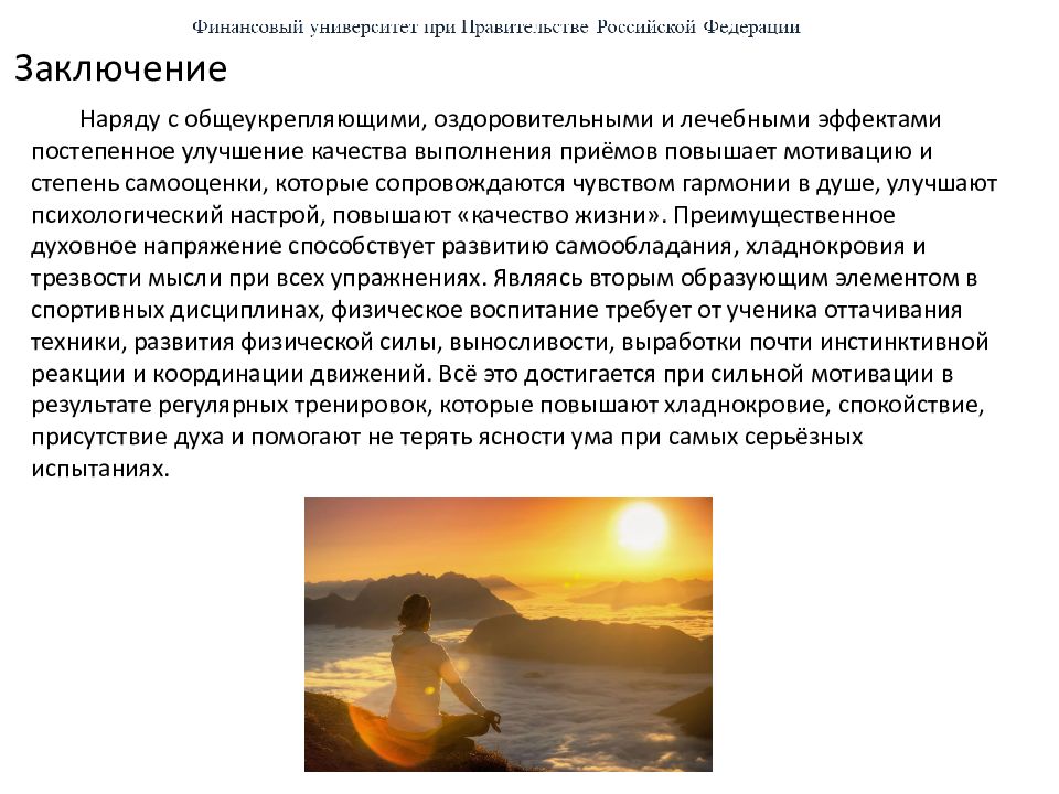 Заключение Наряду с общеукрепляющими, оздоровительными и лечебными эффектами постепенное улучшение качества выполнения приёмов повышает мотивацию и степень самооценки, которые сопровождаются чувством гармонии в душе, улучшают психологический настрой, повышают «качество жизни». Преимущественное духовное напряжение способствует развитию самообладания, хладнокровия и трезвости мысли при всех упражнениях. Являясь вторым образующим элементом в спортивных дисциплинах, физическое воспитание требует от ученика оттачивания техники, развития физической силы, выносливости, выработки почти инстинктивной реакции и координации движений. Всё это достигается при сильной мотивации в результате регулярных тренировок, которые повышают хладнокровие, спокойствие, присутствие духа и помогают не терять ясности ума при самых серьёзных испытаниях.