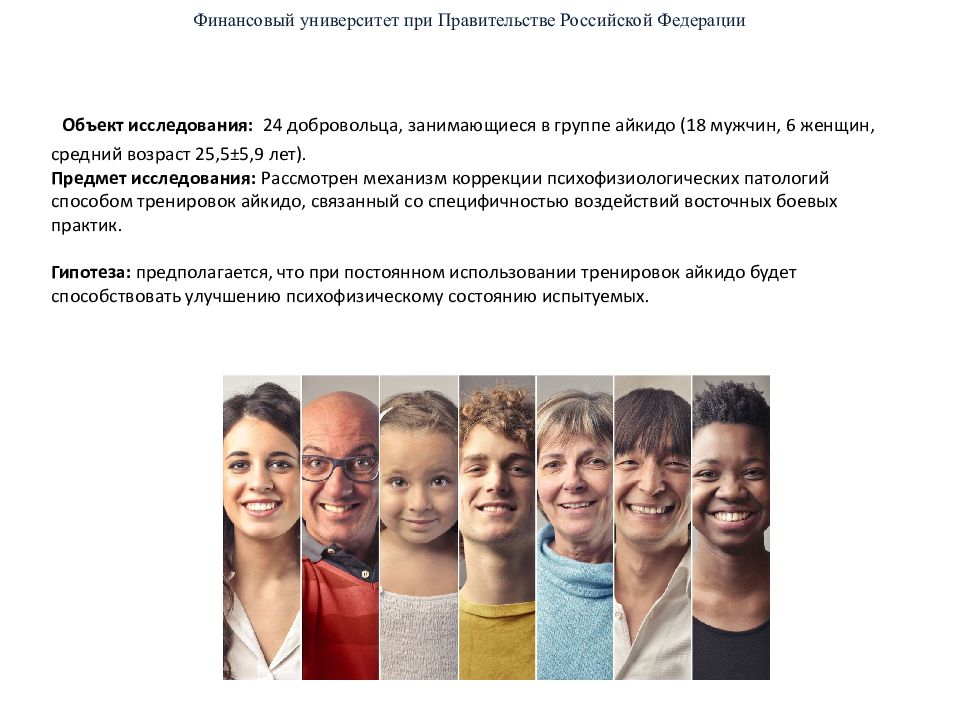 Слайд 4: Объект исследования: 24 добровольца, занимающиеся в группе айкидо (18 мужчин, 6 женщин, средний возраст 25,5±5,9 лет). Предмет исследования: Рассмотрен механизм коррекции психофизиологических патологий способом тренировок айкидо, связанный со специфичностью воздействий восточных боевых практик. Гипотеза: предполагается, что при постоянном использовании тренировок айкидо будет способствовать улучшению психофизическому состоянию испытуемых