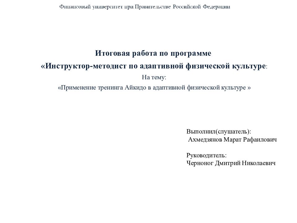 Итоговая работа по программе « Инструктор-методист по адаптивной физической культуре : На тему: «Применение тренинга Айкидо в адаптивной физической культуре » Выполнил(слушатель): Ахмедзянов Марат Рафаилович Руководитель: Черноног Дмитрий Николаевич