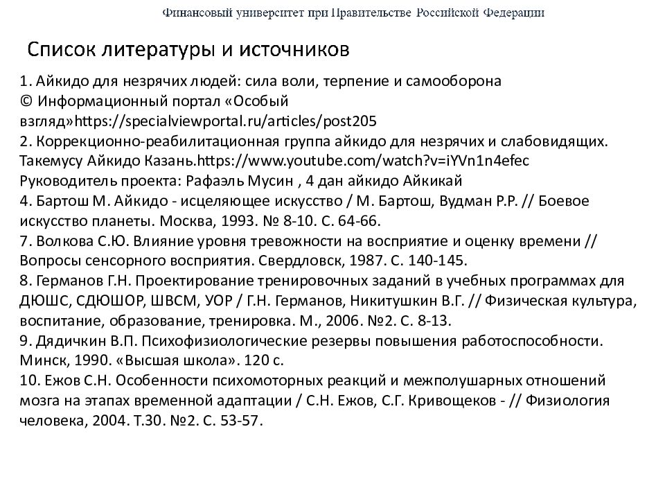 1. Айкидо для незрячих людей: сила воли, терпение и самооборона © Информационный портал «Особый взгляд» https://specialviewportal.ru/articles/post205 2. Коррекционно-реабилитационная группа айкидо для незрячих и слабовидящих. Такемусу Айкидо Казань. https://www.youtube.com/watch?v=iYVn1n4efec Руководитель проекта: Рафаэль Мусин, 4 дан айкидо Айкикай 4. Бартош М. Айкидо - исцеляющее искусство / М. Бартош, Вудман Р.Р. // Боевое искусство планеты. Москва, 1993. № 8-10. С. 64-66. 7. Волкова С.Ю. Влияние уровня тревожности на восприятие и оценку времени // Вопросы сенсорного восприятия. Свердловск, 1987. С. 140-145. 8. Германов Г.Н. Проектирование тренировочных заданий в учебных программах для ДЮШС, СДЮШОР, ШВСМ, УОР / Г.Н. Германов, Никитушкин В.Г. // Физическая культура, воспитание, образование, тренировка. М., 2006. №2. С. 8-13. 9. Дядичкин В.П. Психофизиологические резервы повышения работоспособности. Минск, 1990. «Высшая школа». 120 с. 10. Ежов С.Н. Особенности психомоторных реакций и межполушарных отношений мозга на этапах временной адаптации / С.Н. Ежов, С.Г. Кривощеков - // Физиология человека, 2004. Т.30. №2. С. 53-57.