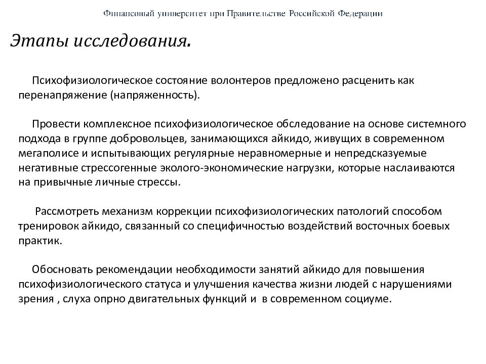 Психофизиологическое состояние волонтеров предложено расценить как перенапряжение (напряженность). Провести комплексное психофизиологическое обследование на основе системного подхода в группе добровольцев, занимающихся айкидо, живущих в современном мегаполисе и испытывающих регулярные неравномерные и непредсказуемые негативные стрессогенные эколого-экономические нагрузки, которые наслаиваются на привычные личные стрессы. Рассмотреть механизм коррекции психофизиологических патологий способом тренировок айкидо, связанный со специфичностью воздействий восточных боевых практик. Обосновать рекомендации необходимости занятий айкидо для повышения психофизиологического статуса и улучшения качества жизни людей с нарушениями зрения, слуха опрно двигательных функций и в современном социуме.