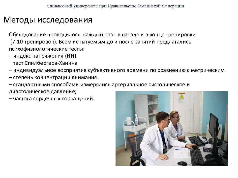 Обследование проводилось каждый раз - в начале и в конце тренировки (7-10 тренировок). Всем испытуемым до и после занятий предлагались психофизиологические тесты: – индекс напряжения (ИН). – тест Спилбергера -Ханина – индивидуальное восприятие субъективного времени по сравнению с метрическим – степень концентрации внимания. – стандартными способами измерялись артериальное систолическое и диастолическое давление; – частота сердечных сокращений. Методы исследования