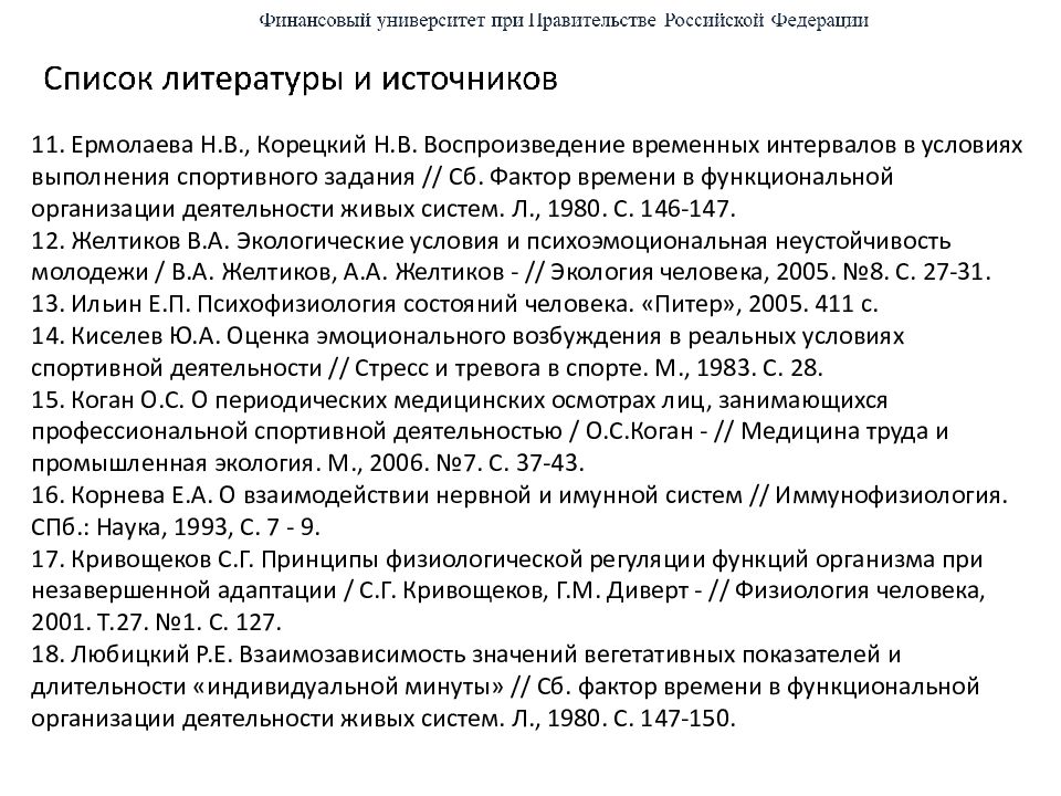 11. Ермолаева Н.В., Корецкий Н.В. Воспроизведение временных интервалов в условиях выполнения спортивного задания // Сб. Фактор времени в функциональной организации деятельности живых систем. Л., 1980. С. 146-147. 12. Желтиков В.А. Экологические условия и психоэмоциональная неустойчивость молодежи / В.А. Желтиков, А.А. Желтиков - // Экология человека, 2005. №8. С. 27-31. 13. Ильин Е.П. Психофизиология состояний человека. «Питер», 2005. 411 с. 14. Киселев Ю.А. Оценка эмоционального возбуждения в реальных условиях спортивной деятельности // Стресс и тревога в спорте. М., 1983. С. 28. 15. Коган О.С. О периодических медицинских осмотрах лиц, занимающихся профессиональной спортивной деятельностью / О.С.Коган - // Медицина труда и промышленная экология. М., 2006. №7. С. 37-43. 16. Корнева Е.А. О взаимодействии нервной и имунной систем // Иммунофизиология. СПб.: Наука, 1993, С. 7 - 9. 17. Кривощеков С.Г. Принципы физиологической регуляции функций организма при незавершенной адаптации / С.Г. Кривощеков, Г.М. Диверт - // Физиология человека, 2001. Т.27. №1. С. 127. 18. Любицкий Р.Е. Взаимозависимость значений вегетативных показателей и длительности «индивидуальной минуты» // Сб. фактор времени в функциональной организации деятельности живых систем. Л., 1980. С. 147-150.