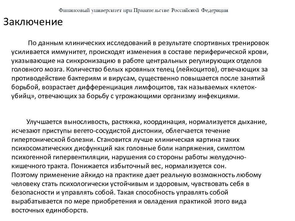По данным клинических исследований в результате спортивных тренировок усиливается иммунитет, происходят изменения в составе периферической крови, указывающие на синхронизацию в работе центральных регулирующих отделов головного мозга. Количество белых кровяных телец (лейкоцитов), отвечающих за противодействие бактериям и вирусам, существенно повышается после занятий борьбой, возрастает дифференциация лимфоцитов, так называемых «клеток-убийц», отвечающих за борьбу с угрожающими организму инфекциями. Заключение Улучшается выносливость, растяжка, координация, нормализуется дыхание, исчезают приступы вегето-сосудистой дистонии, облегчается течение гипертонической болезни. Становится лучше клиническая картина таких психосоматических дисфункций как головные боли напряжения, симптом психогенной гипервентиляции, нарушения со стороны работы желудочно-кишечного тракта. Понижается избыточный вес, нормализуется сон. Поэтому применение айкидо на практике дает реальную возможность любому человеку стать психологически устойчивым и здоровым, чувствовать себя в безопасности и управлять собой. Такая способность управлять собой вырабатывается по мере приобретения и овладения практикой этого вида восточных единоборств.