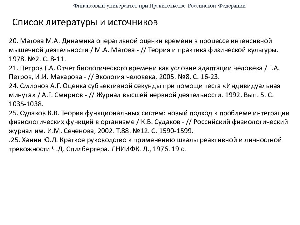 20. Матова М.А. Динамика оперативной оценки времени в процессе интенсивной мышечной деятельности / М.А. Матова - // Теория и практика физической культуры. 1978. №2. С. 8-11. 21. Петров Г.А. Отчет биологического времени как условие адаптации человека / Г.А. Петров, И.И. Макарова - // Экология человека, 2005. №8. С. 16-23. 24. Смирнов А.Г. Оценка субъективной секунды при помощи теста «Индивидуальная минута» / А.Г. Смирнов - // Журнал высшей нервной деятельности. 1992. Вып. 5. С. 1035-1038. 25. Судаков К.В. Теория функциональных систем: новый подход к проблеме интеграции физиологических функций в организме / К.В. Судаков - // Российский физиологический журнал им. И.М. Сеченова, 2002. Т.88. №12. С. 1590-1599. .25. Ханин Ю.Л. Краткое руководство к применению шкалы реактивной и личностной тревожности Ч.Д. Спилбергера. ЛНИИФК. Л., 1976. 19 с.