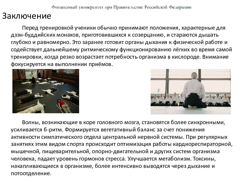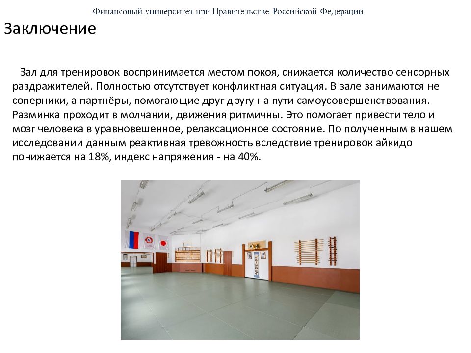 Заключение Зал для тренировок воспринимается местом покоя, снижается количество сенсорных раздражителей. Полностью отсутствует конфликтная ситуация. В зале занимаются не соперники, а партнёры, помогающие друг другу на пути самоусовершенствования. Разминка проходит в молчании, движения ритмичны. Это помогает привести тело и мозг человека в уравновешенное, релаксационное состояние. По полученным в нашем исследовании данным реактивная тревожность вследствие тренировок айкидо понижается на 18%, индекс напряжения - на 40%.