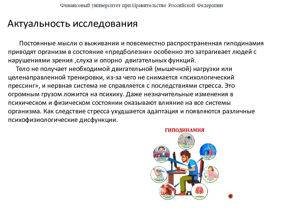 Актуальность исследования Постоянные мысли о выживании и повсеместно распространенная гиподинамия приводят организм в состояние «предболезни» особенно это затрагивает людей с нарушениями зрения,слуха и опорно двигательных функций. Тело не получает необходимой двигательной (мышечной) нагрузки или целенаправленной тренировки, из-за чего не снимается «психологический прессинг», и нервная система не справляется с последствиями стресса. Это огромным грузом ложится на психику. Даже незначительные изменения в психическом и физическом состоянии оказывают влияние на все системы организма. Как следствие стресса ухудшается адаптация и появляются различные психофизиологические дисфункции.