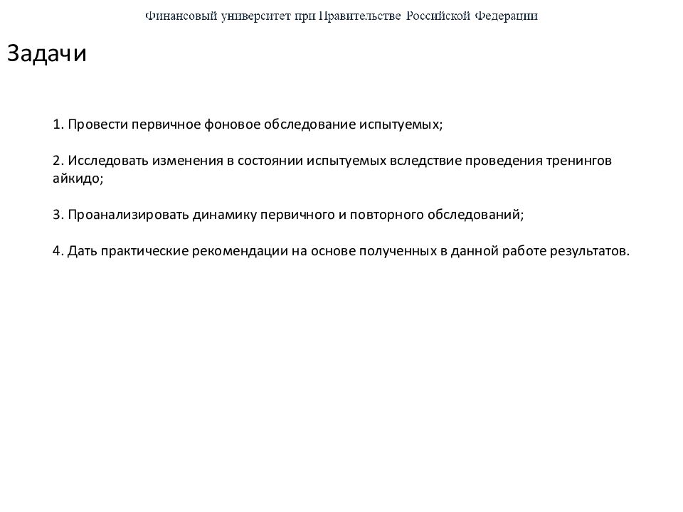 1. Провести первичное фоновое обследование испытуемых; 2. Исследовать изменения в состоянии испытуемых вследствие проведения тренингов айкидо; 3. Проанализировать динамику первичного и повторного обследований; 4. Дать практические рекомендации на основе полученных в данной работе результатов. Задачи